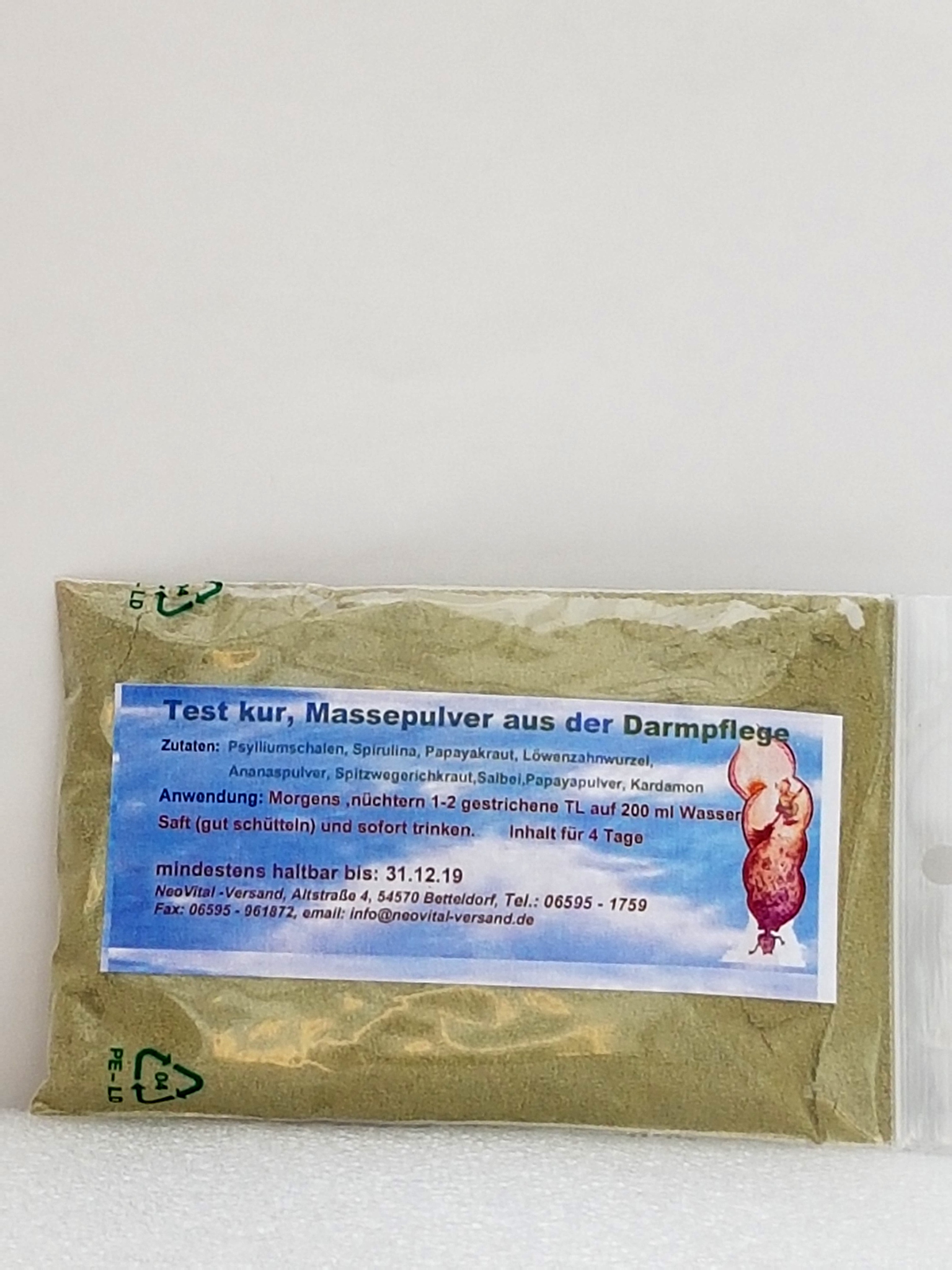 Diese Testpackung beinhaltet das Massepulver aus der Darmpflege-Kur. Ausreichend für ca. 4 Tage.